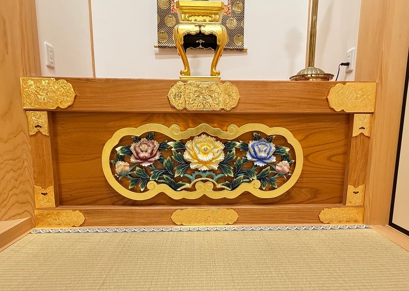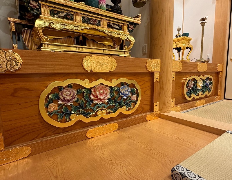 お仏壇の店舗はございませんが、檀家様お仏壇納入のお声掛けをいただきました。今回は久々の金仏壇で、専門店としては張り切ってお整えさせていただきました。