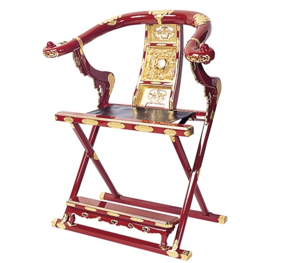 朱または黒塗 手打ち金具打ち 座面本革 折畳式