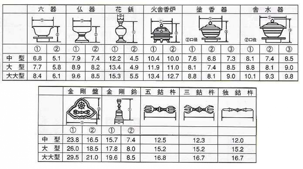 六器一組、仏器一対、華瓶一対、塗香器、洒水器、金剛鈴、